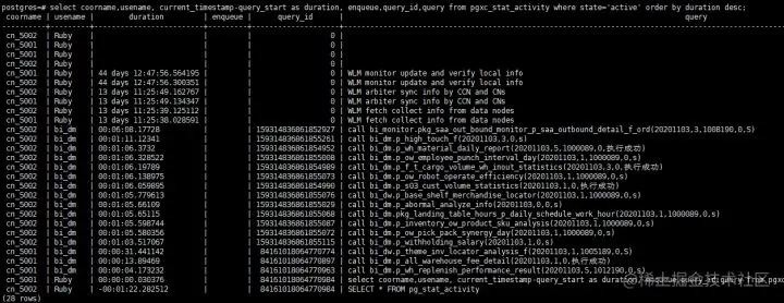 #查询当前执行时间最长的语句的排队状态,query_id(数据库中作业的唯一标识),以及详细的语句信息。 select coorname,usename, current_timestamp-query_start as duration, enqueue,query_id,query from pgxc_stat_activity where state='active' and usename <> 'Ruby' order by duration desc;
