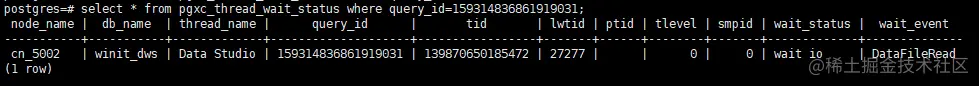 #在根据pgxc_stat_activity查询到具体执行时间长的语句之后,可以根据本视图查询: select * from pgxc_thread_wait_status where query_id = xxxxxxxx;