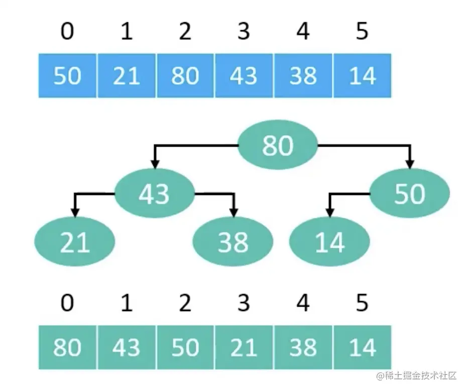 将第一个元素与最后一个元素交换位置(大顶堆,交换堆顶元素和堆尾元素)。