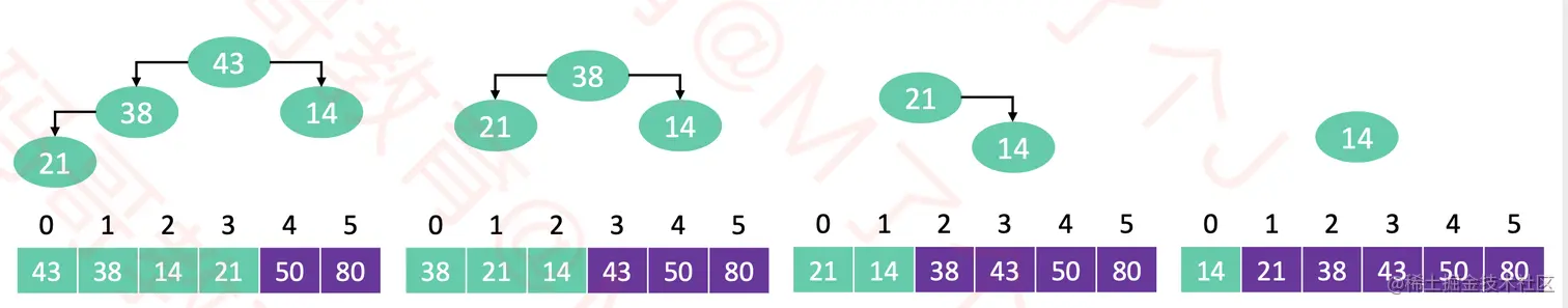 - 重复上面2~4步,直到堆元素只剩1个。