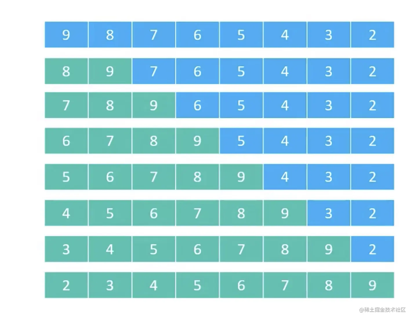 从头开始扫描每个元素,每当扫描到一个元素,就将它插入到头部合适的位置,使得头部数据依然有序。