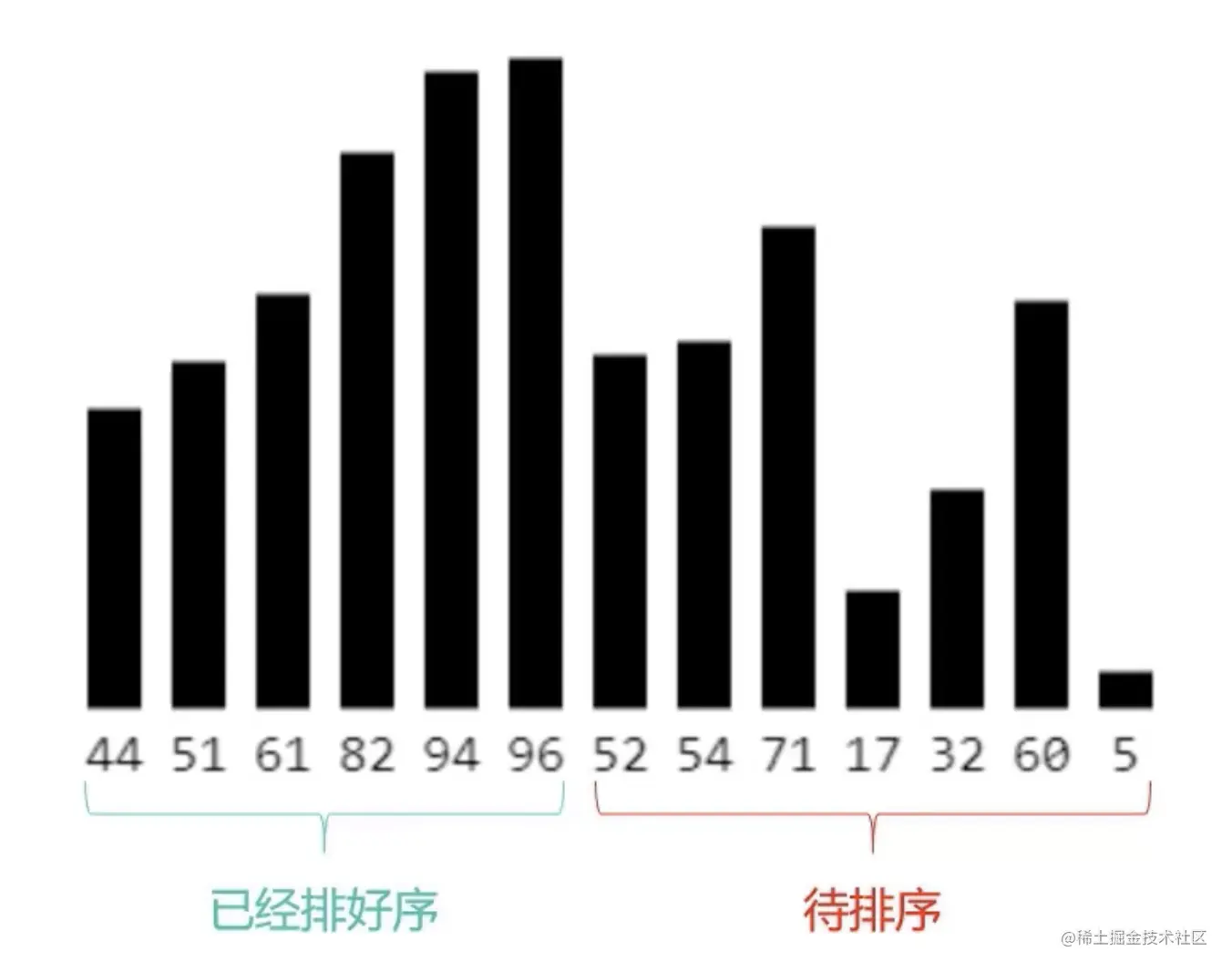 将序列分成两部分,头部是已排序好的,尾部是待排序的。