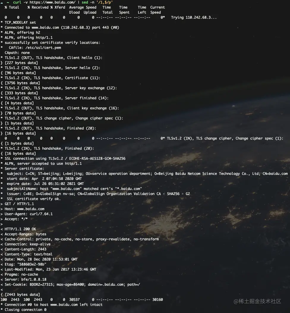 curl -v https://www.baidu.com/ | sed -n '/1,$/p'