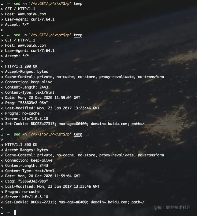 备注:管道之后处理的不包含头部这一部分,如果想单纯拿到请求头和响应头,可以将整个过程写到文件中,对文件执行sed -n '/^>.GET/,/^<\s+/p'就能确切筛选