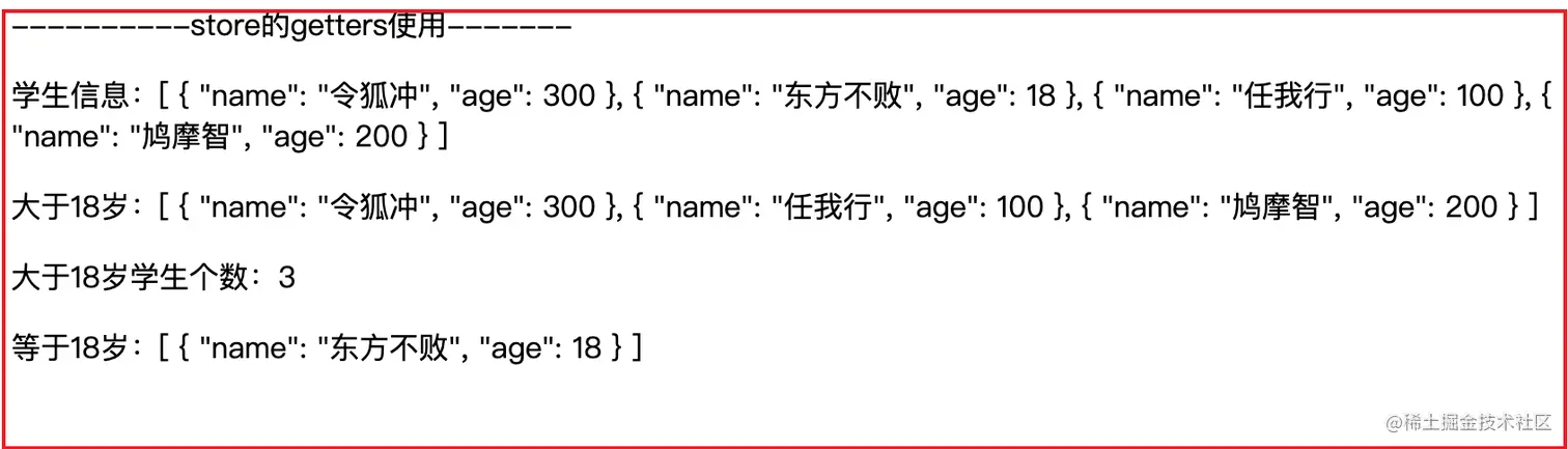<p>等于18岁:{{ $store.getters.studentById(18) }}</p>
