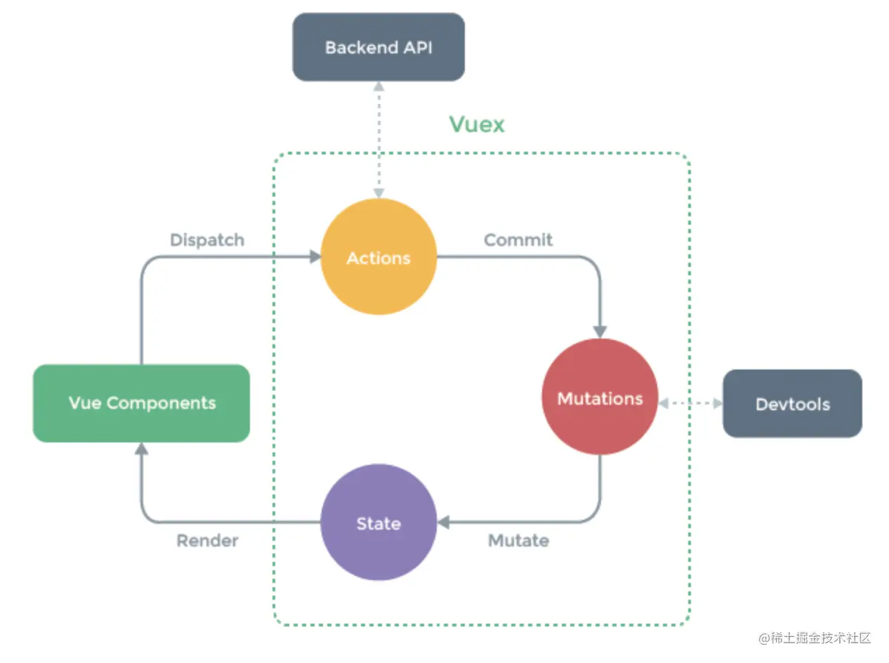 Actions模块的主要作用是进行异步操作,如果vue组件修改state状态需要进行异步操作,那么就需要Actions模块;Backend(后端)API调用。Actions将异步处理完的结果commit到Mutations中,Muations再进行同步操作;如果没有异步操作那么Actions模块也可以不要了;vue组件就直接跟Mutations模块交互了,这个官方也是允许的。