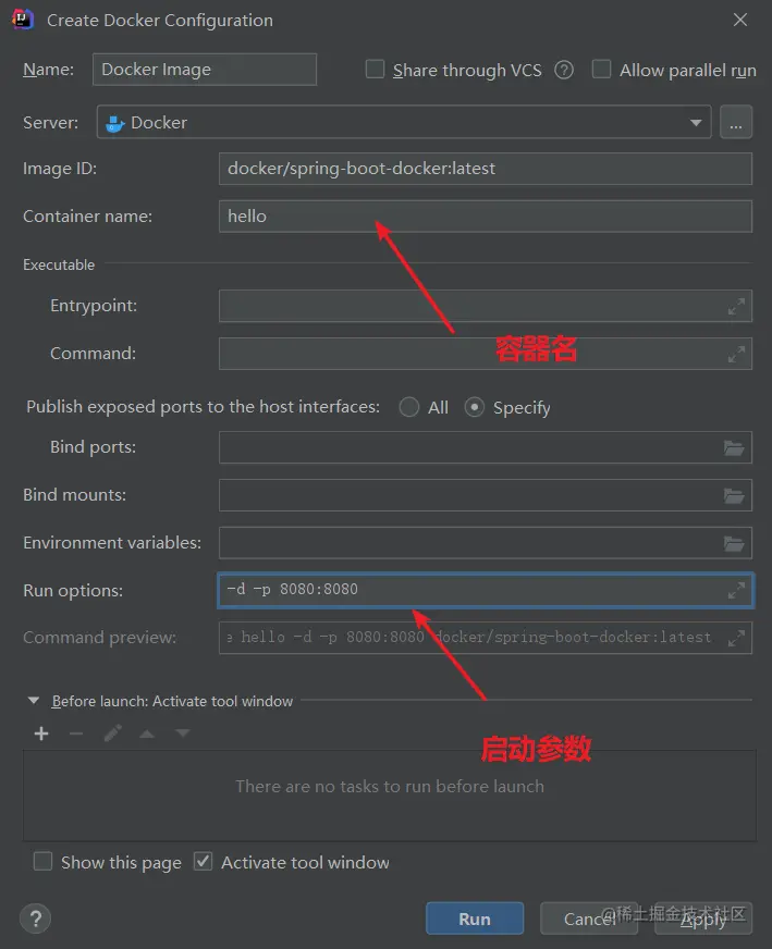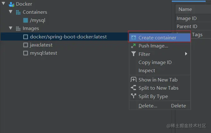 Docker控制台选中镜像右键,点击创建镜像,填写参数,点击run
