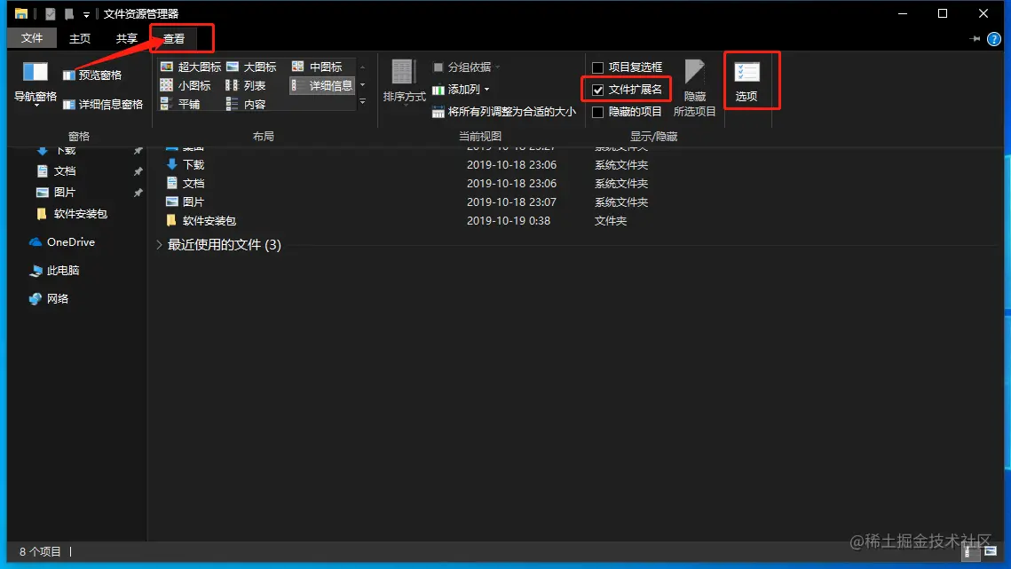 - 在查看选项中,将文件扩展名勾选,并打开选项设置;