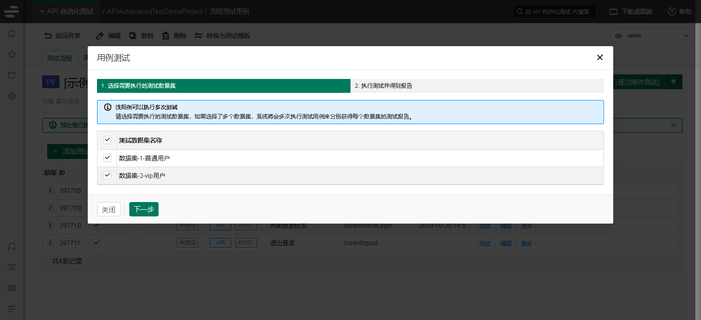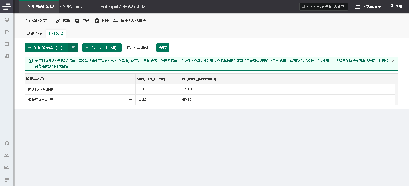 在Eolinker的流程测试用例中可以使用数据集的功能,实现不同场景使用多组数据进行测试。如下图所示,在数据集界面创建普通用户与VIP用户。