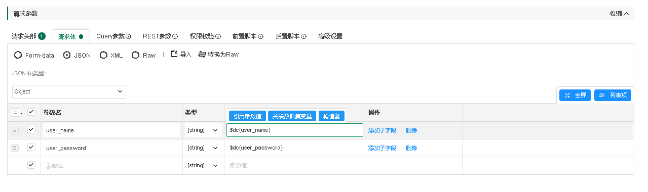 在单个API测试中,以简单的登录接口为例,请求参数有user_name,user_password。