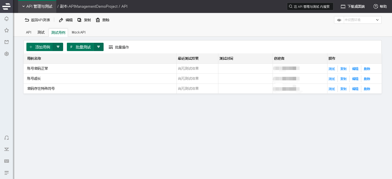 在测试时可以创建多个测试用例进行测试,每一组测试用例代表一组数据,这里举了三个例子。当API更新后,基础的参数规则不变则可以使用批量测试快速进行测试。