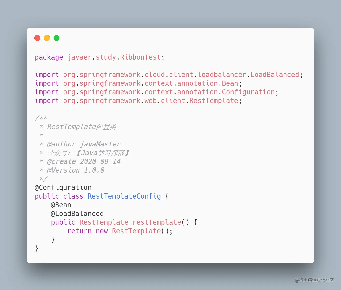 第一步,我们依旧使用RibbonClient工程,我们创建一个RestTemplateConfig类来配置RestTemplate实例。