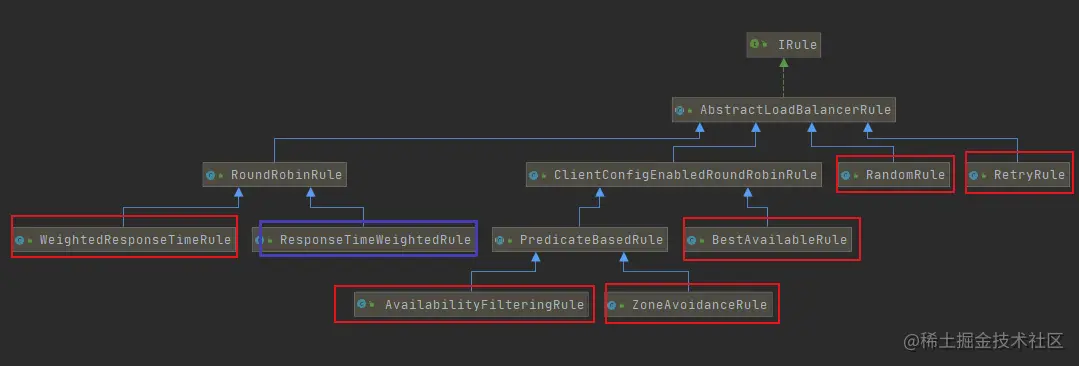 通过图上的继承关系我们可知RoundRobinRule和WeightedResponseTimeRule是继承和被继承的关系。
