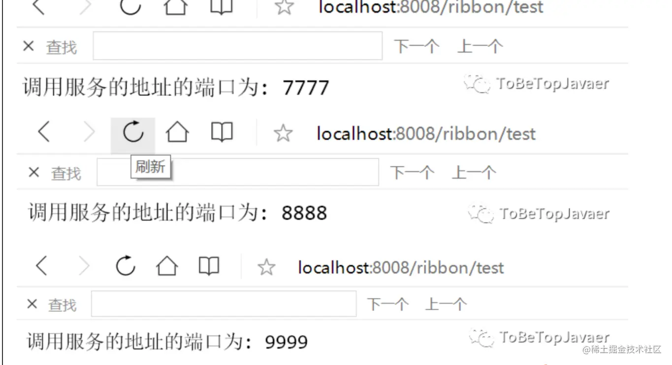 项目启动成功后,我们访问 http://localhost:8008/ribbon/test,刷新三次页面我们,访问结果依次如下: