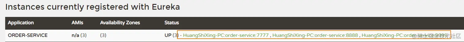 然后我们刷新之前打开的 http://localhost:8761/ 页面,我们发现此时已经有三个服务名为order-service,端口号分别7777,8888,9999的服务注册了进来:
