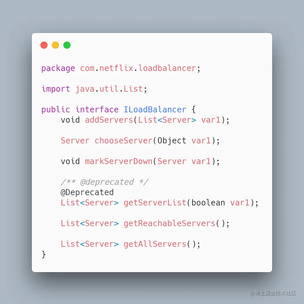 ILoadBalancer最重要的重要是获取所有的服务节点信息,或者是获取可访问的服务节点信息,然后通过ServerListFilter按照指定策略过滤服务节点列表,通过ServerListUpdater动态更新一组服务列表,通过IPing剔除非存活状态下的服务节点以及根据IRule从现有服务器列表中选择一个服务。