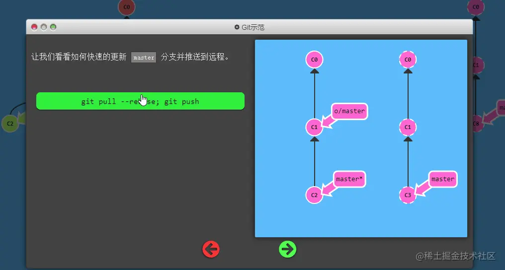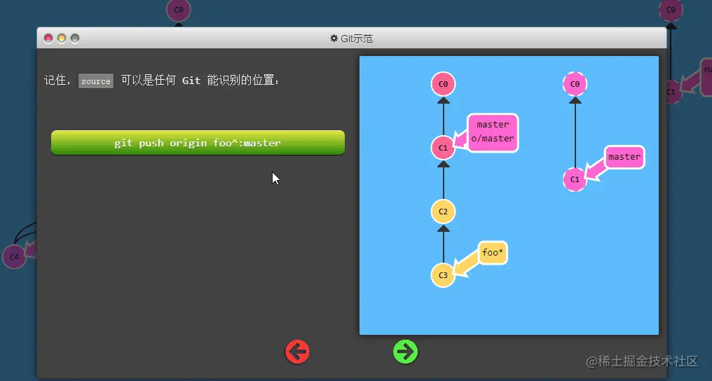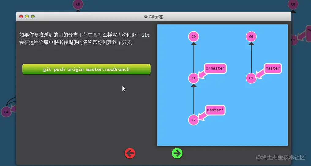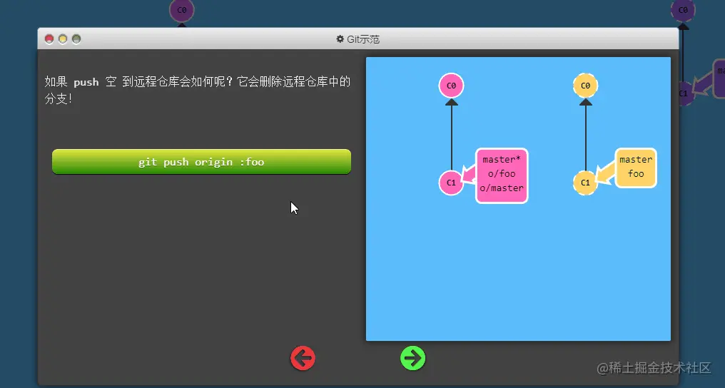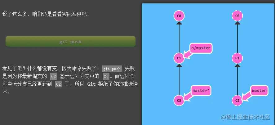 master推到远程仓库中的master分支(同时会更新远程分支o/master) 。这个推送的目的地也是由这种关联确定的!