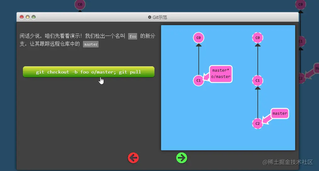 使用该方式会在本地新建分支 foo,并自动切换到该本地分支 foo。采用此种方法建立的本地分支会和远程分支 o/master 建立映射关系。