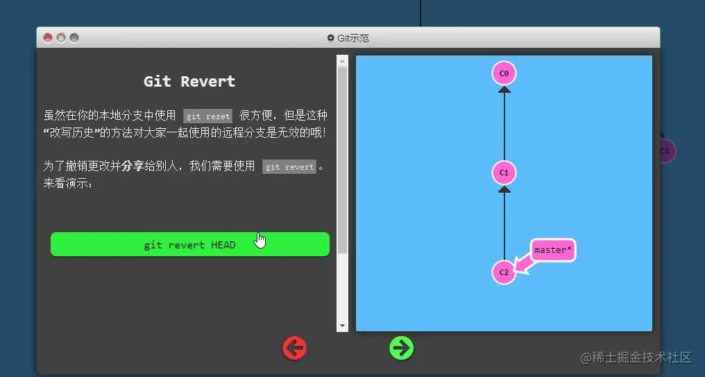 虽然在你的本地分支中使用 git reset 很方便,但是这种“改写历史”的方法对大家一起使用的远程分支是无效的哦!为了撤销更改并分享给别人,我们需要使用 git revert。