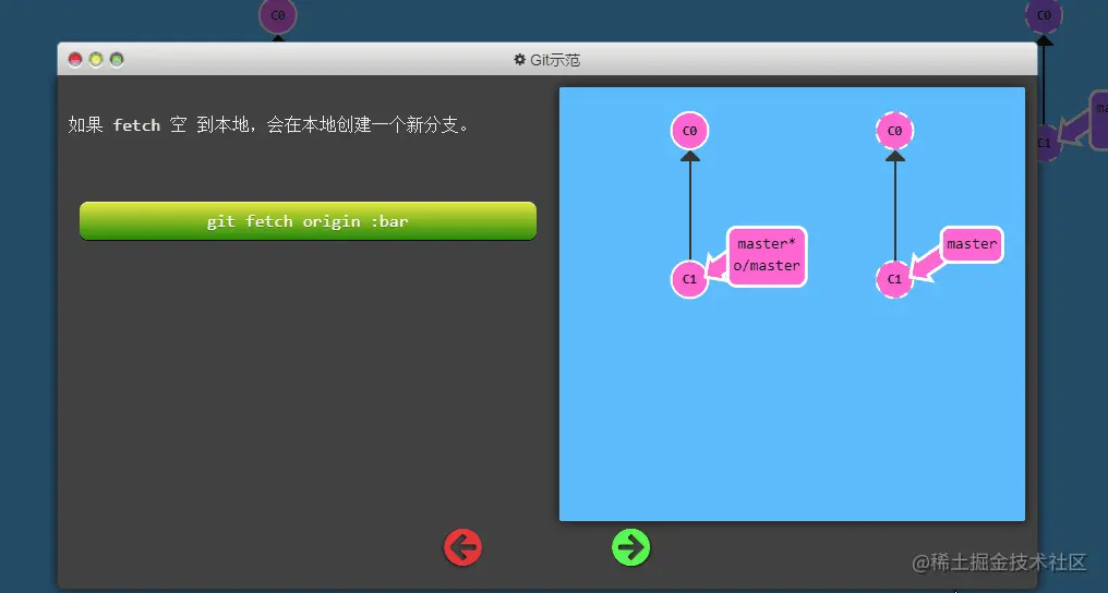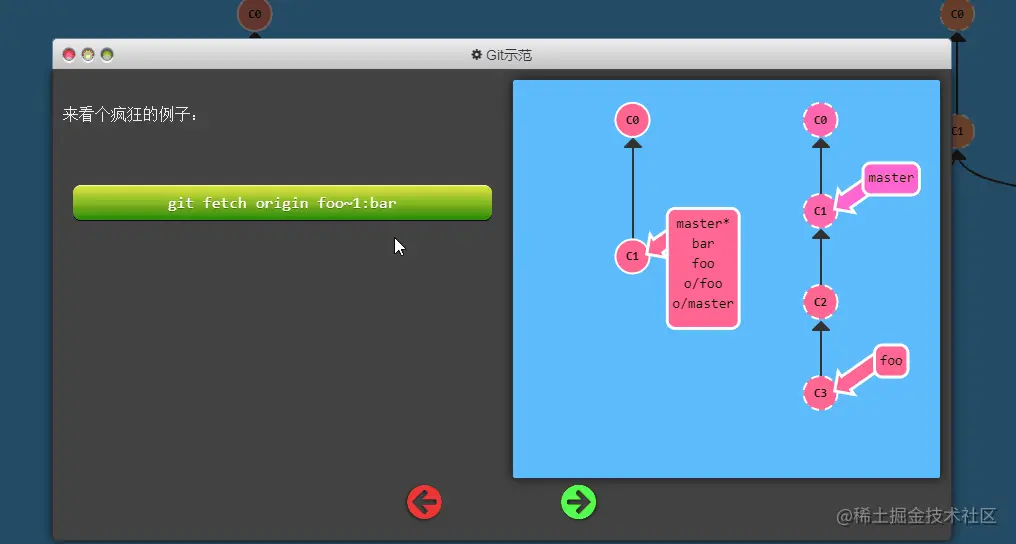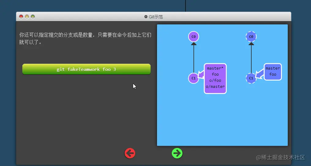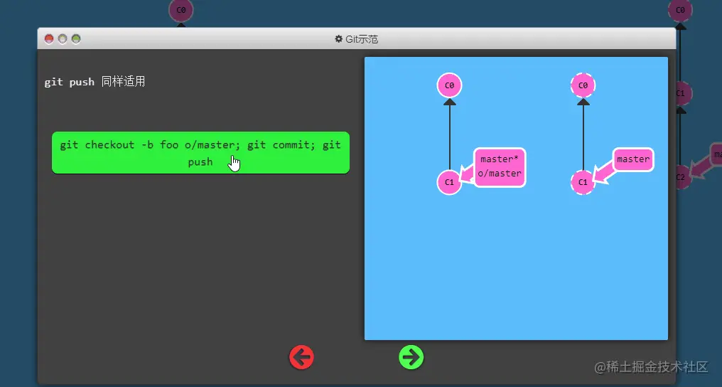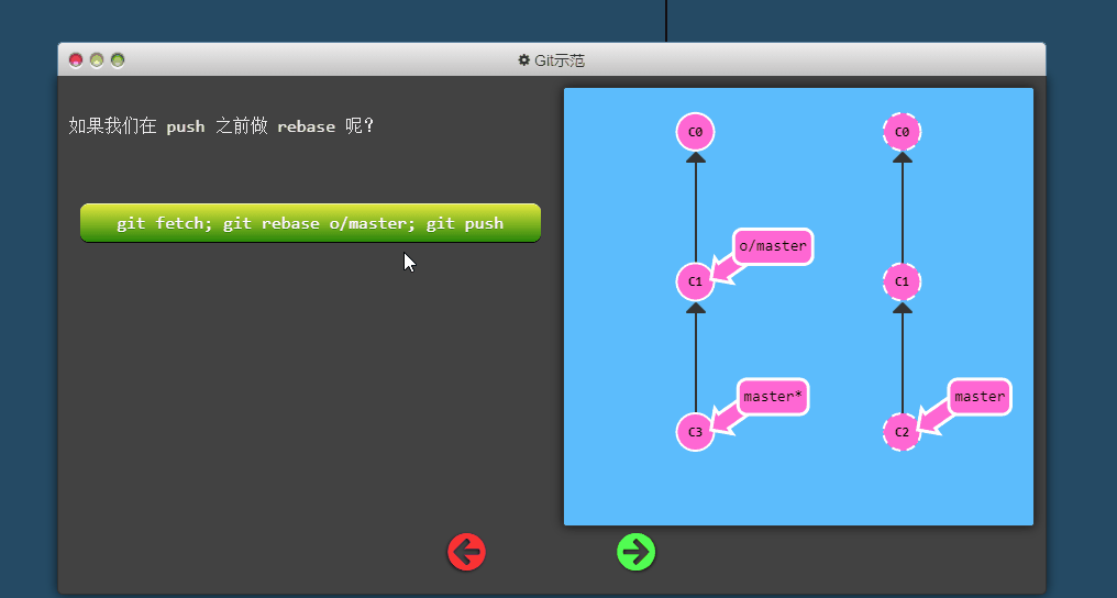 不过 origin 对于我们的 UI 来说太长了,因此不得不使用简写 o :) 但是要记住, 当你使用真正的 Git 时, 你的远程仓库默认为 origin!
