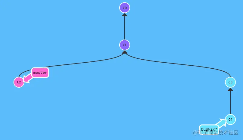 目标: 从 bugFix 分支中分离出 HEAD 并让其指向一个提交记录。