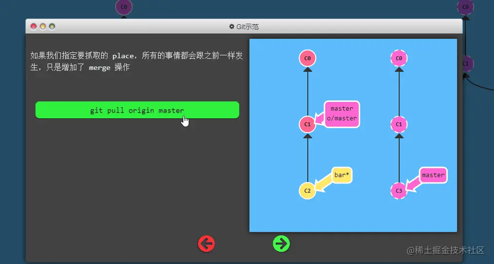 - pull 操作时, 提交记录会被先下载到 o/master 上,之后再合并到本地的 master 分支。隐含的合并目标由这个关联确定的。