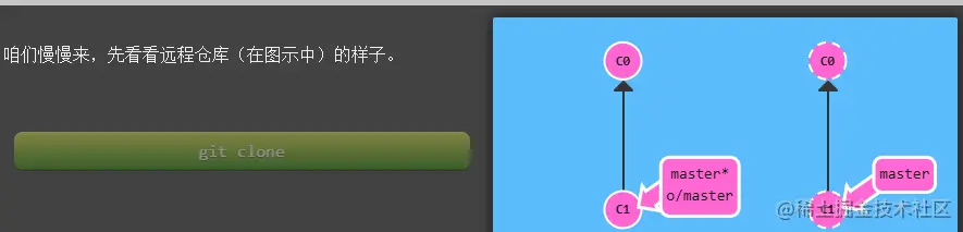 当你克隆时, Git 会为远程仓库中的每个分支在本地仓库中创建一个远程分支(比如 o/master)。然后再创建一个跟踪远程仓库中活动分支的本地分支,默认情况下这个本地分支会被命名为 master。