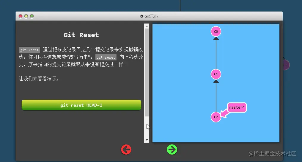 git reset 通过把分支记录回退几个提交记录来实现撤销改动。你可以将这想象成“改写历史”。git reset 向上移动分支,原来指向的提交记录就跟从来没有提交过一样。