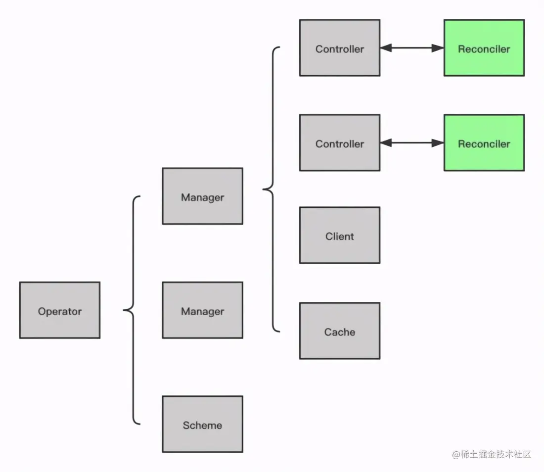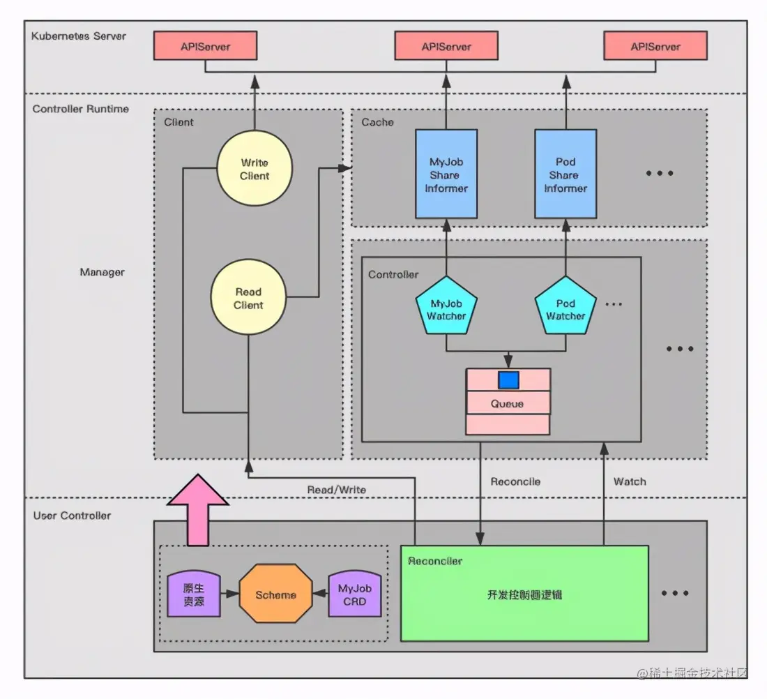 该对象跟开发者要实现的逻辑 Reconciler 是一一对应的关系,里面有创建的带限速功能的 Queue,以及该 Controller 关注 GVK 的 Watcher,一个 Controller 可以关注很多 GVK,该关注会根据 GVK 到 Cache 里面找到对应的 Share Informer 去 Watch 资源,Watch 到的事件会加入到 Queue里面,Queue 最终触发开发者的 Reconciler 的调和。