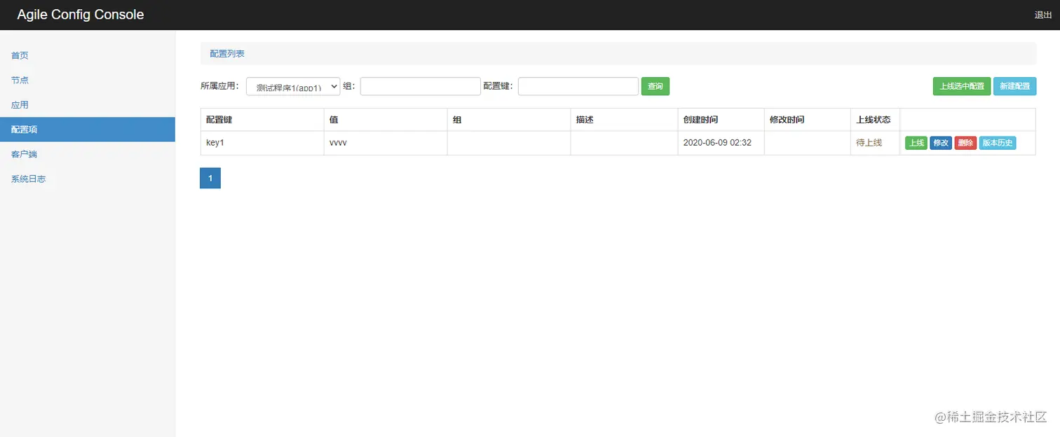 配置完应用信息后可以为每个应用配置配置项。配置项支持分组。新添加的配置并不会被客户端感知到,需要手工点击“上线”才会推送给客户端。已上线的配置如果发生修改、删除、回滚操作,会实时推送给客户端。版本历史记录了配置的历史信息,可以回滚至任意版本。
