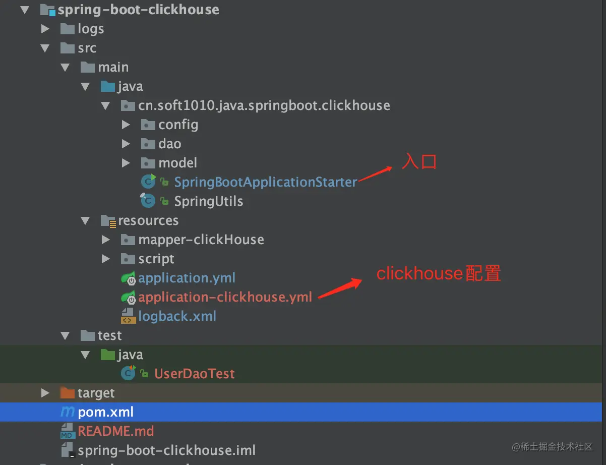 除了clickhouse-jdbc 驱动之外,我们这里查询使用到了分页,所以多了一个pagehelper,其他的依赖我们就不在这里列出了,可以直接参考文章最后的源码