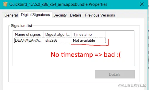 Visual Studio可以被指示签署AppxBundle,但由于一些莫名其妙的原因,它不会给它加时间戳。