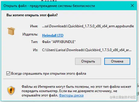 Appx将被签署,并准备好被分发。当用户双击它时,他们会看到一个标准的安装屏幕。如果他们在线下载Appx,他们可能会得到 "你想打开这个文件吗 "的对话框。一个更昂贵的EV(扩展验证)证书会让这个警告窗口变成绿色,但也仅此而已。你可以在我的github上得到签名的Appx来测试。
