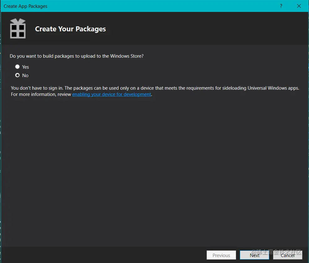 - 在Release模式下构建应用程序包。当被问到 "你是否在为商店构建包 "时,选择 "No"