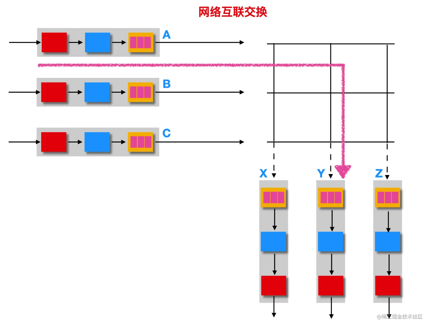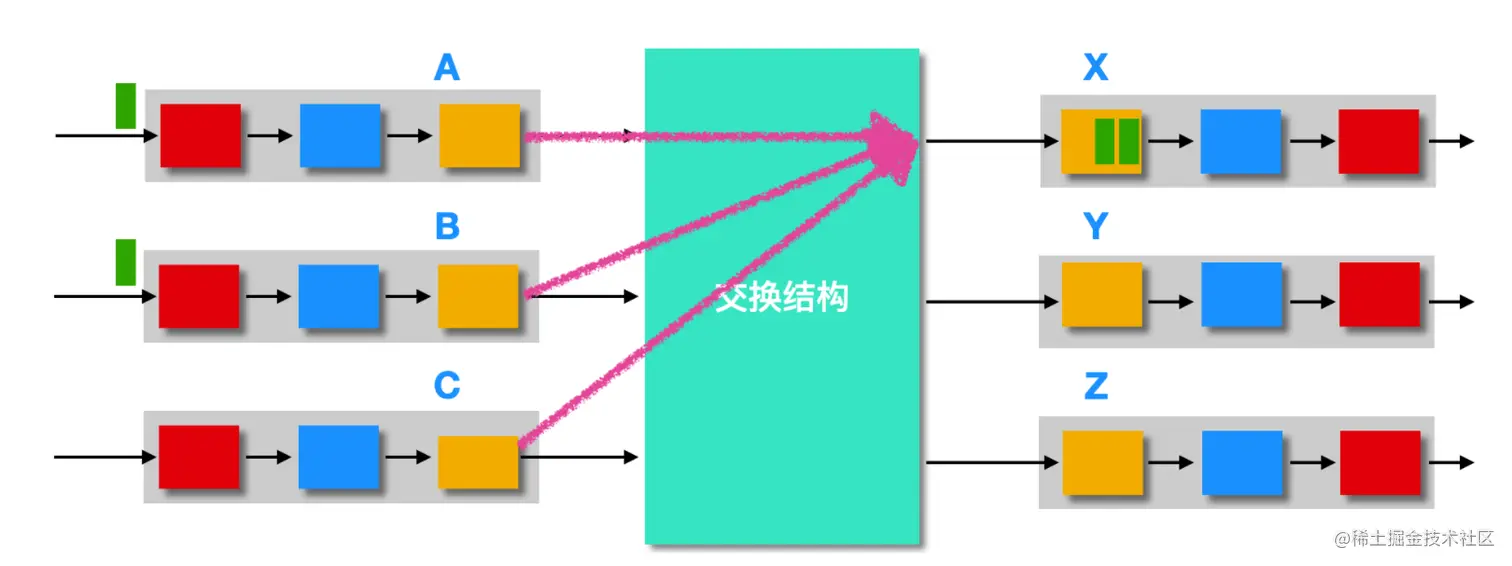 一旦通过查找功能确定了分组的输出端口后,那么该分组就会进入交换结构。在进入交换结构时,如果交换结构正在被使用,就会阻塞新到的分组,等到交换结构调度新的分组。