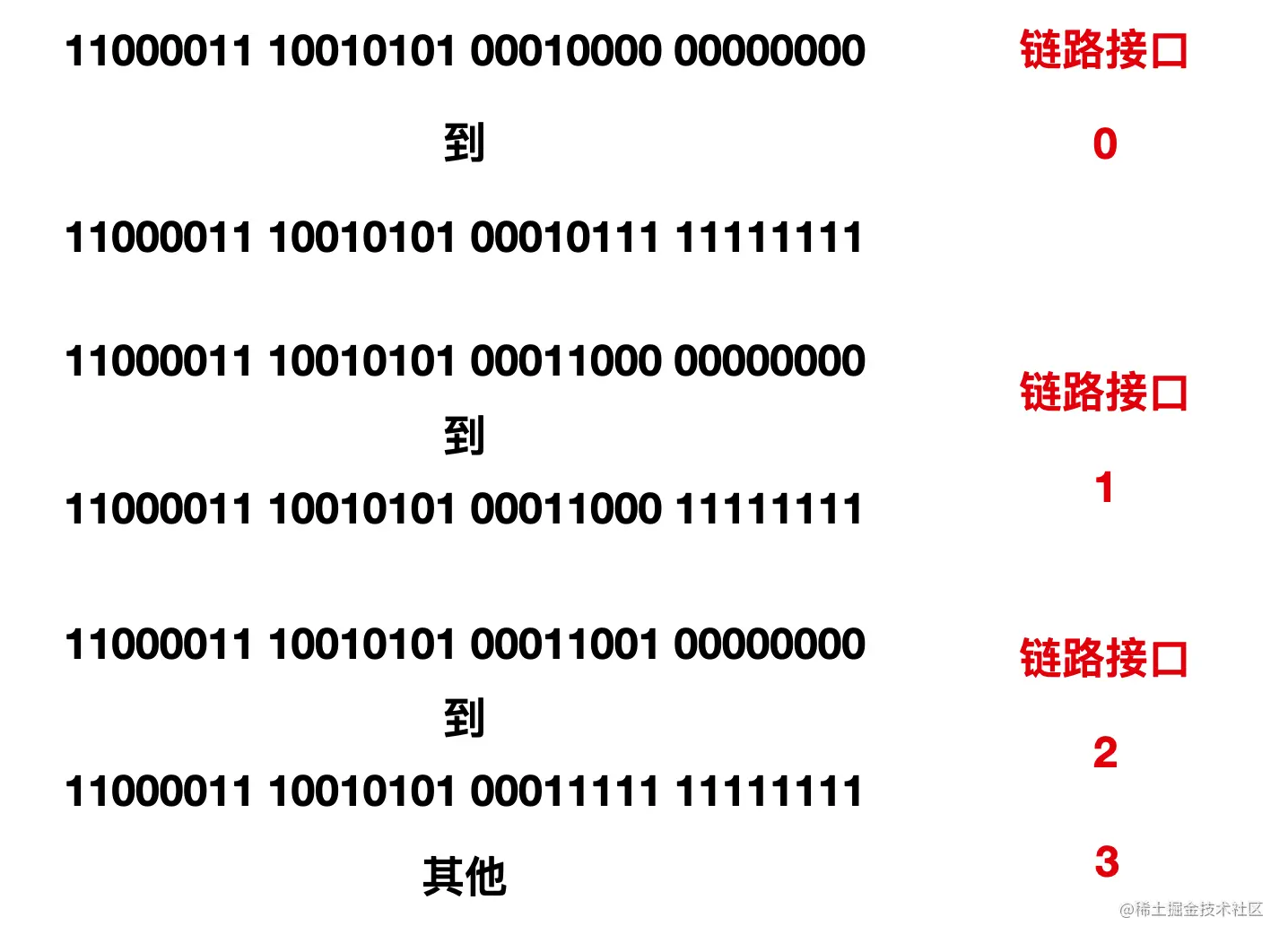 可以看到,对于这个例子来说,路由器转发表中不需要那么多条链路,只需要四条就够,即对应输出链路 0 1 2 3 。也就是说,能够使用 4 个转发表就可以实现亿级链路。