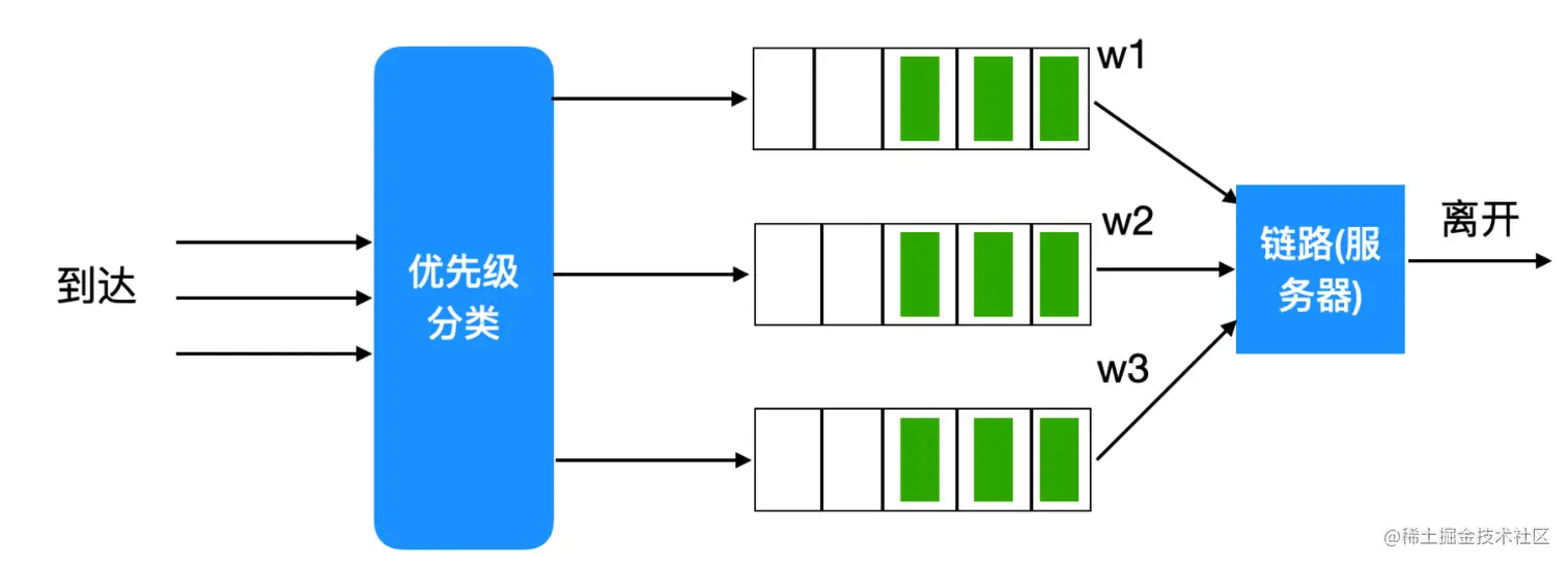 优先级排队是先进先出排队的改良版本,到达输出链路的分组被分类放入输出队列中的优先权类,如下图所示