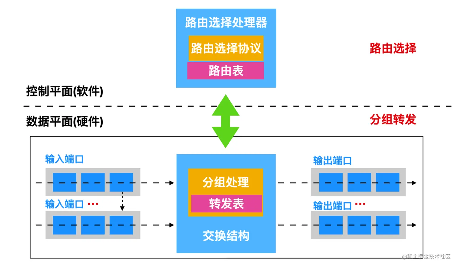 输出端口(Output ports)通过交换结构转发分组,并通过物理层和数据链路层的功能传输分组,因此,输出端口作为输入端口执行反向数据链接和物理层功能。 - 路由选择处理器: