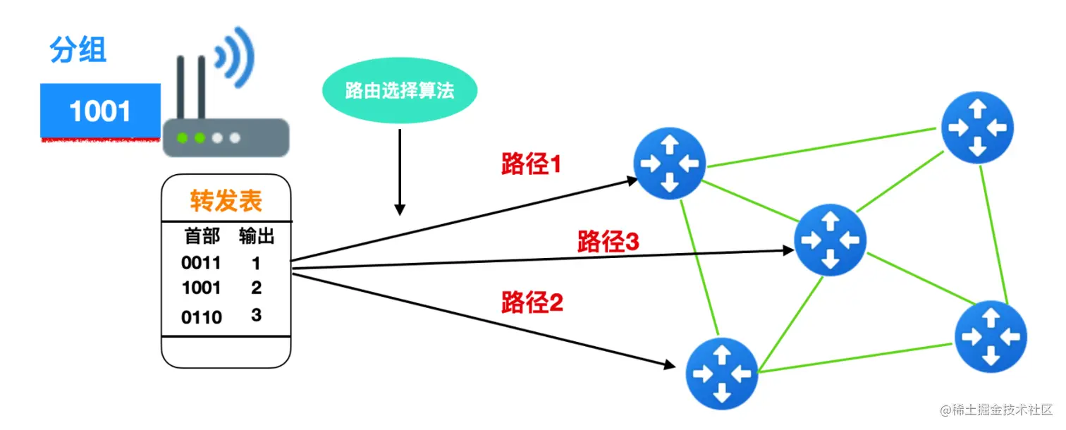 上图中有一个 1001 分组到达路由器后,首先会在转发表中进行索引,然后由路由选择算法决定分组要走的路径。每台路由器都有两种功能:转发和路由选择。下面我们就来聊一聊路由器的工作原理。