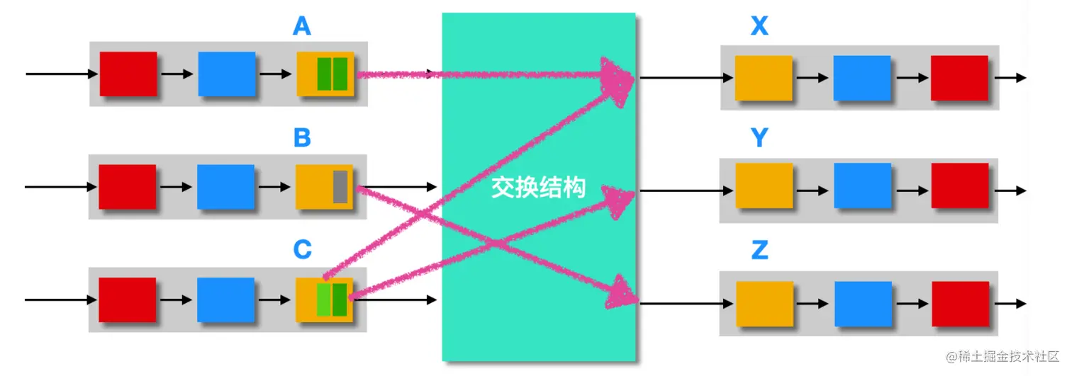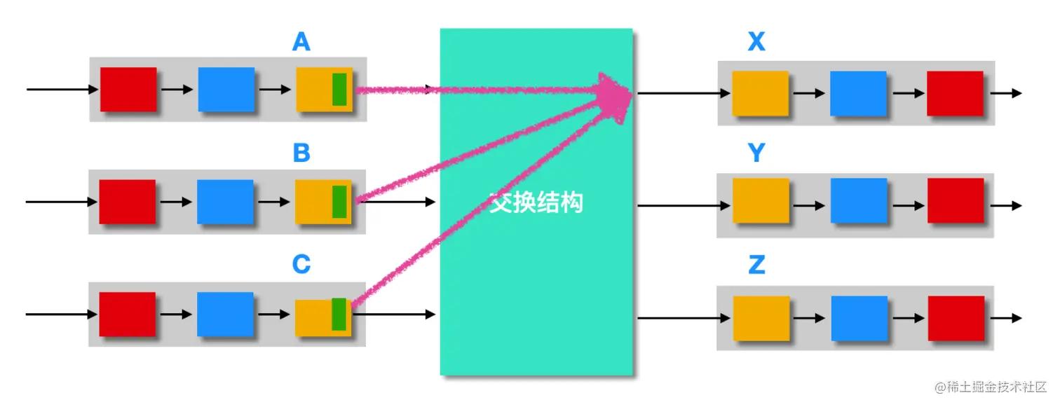 在输入端口中有等待进入交换的排队队列,而在输出端口中有等待转发的排队队列,排队的位置和程度取决于流量负载、交换结构的相对频率和线路速率。