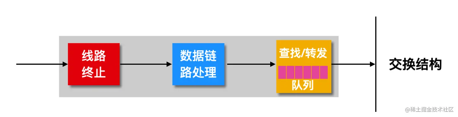 上面介绍了输入端口有很多功能,包括线路终端、数据处理、查找转发,其实这些功能在输入端口的内部有相应的模块,输入端口的内部实现如下图所示
