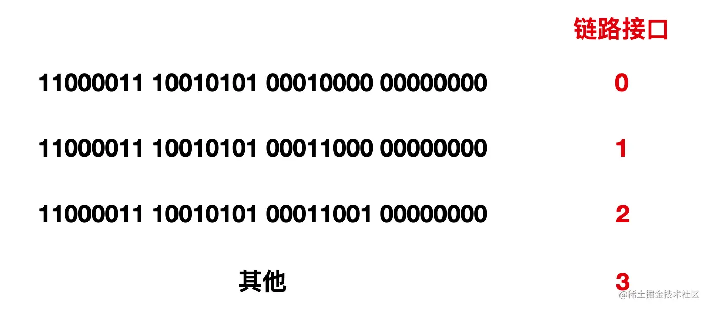比如这时有一个分组是 11000011 10010101 00010000 0001100 到达,因为这个分组与 11000011 10010101 00010000 相匹配,所以路由器会转发到 0 链路接口上。如果一个前缀不匹配上面三个输出链路中的一种,那么路由器将向链路接口 3 进行转发。