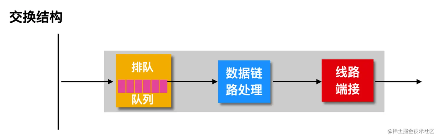 如果交换结构的处理速度没有输入队列到达的速度快,在这种情况下,输入端口将会出现排队情况,到达交换结构前的分组会加入输入端口队列中,以等待通过交换结构传送到输出端口。