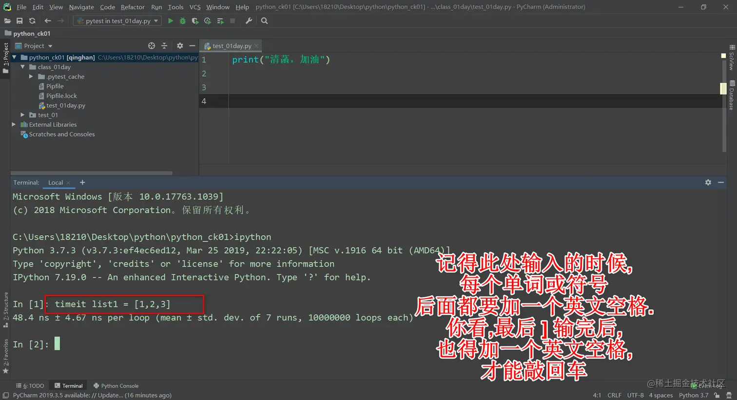 敲完这行命令,返回了一行时间。这个是在内存中初始化一个列表,如图可以看到创建了一千万次,时间是 48.4ns