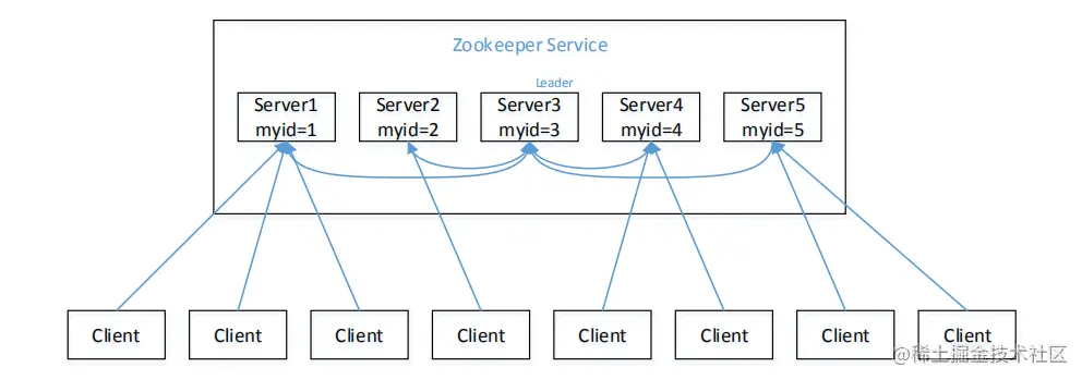 Zookeeper 身为分布式系统协调服务,如果自身挂了如何处理呢?为了防止单机挂掉的情况,Zookeeper 维护了一个集群。如下图: