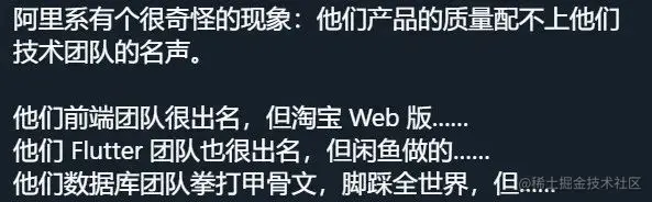 我还听到一种(瞎)说法,就是因为阿里的技术太强了,导致产品经理和设计师都不敢去跟技术 Battle。产品狗和程序猿的天平被严重破坏,导致技术说实现不了的时候,产品经理也不敢反抗。