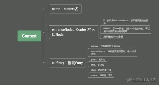 Context 维持着入口节点(entranceNode)、本次调用链路的 当前节点(curNode)、调用来源(origin)等信息。Context 名称即为调用链路入口名称。