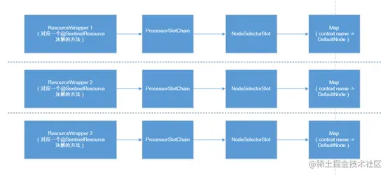 熟悉的代码风格。我们知道一个资源对应一个责任链。每个调用链中都有NodeSelectorSlot。NodeSelectSlot中的node缓存map是非静态变量,所以map只对当前这个资源共用,不同的资源对应的NodeSelectSlot及Node的缓存都是不一样的,资源和Node缓存map的关系可见下图。
