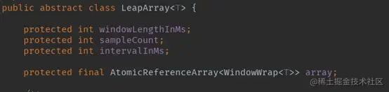 LeapArray是时间窗口数组。基本信息包括:时间窗口长度(ms,windowLengthInMs),取样数(也就是时间窗口的数量,sampleCount),时间间隔(ms,intervalInMs),以及时间窗口数组(array)。时间窗口长度、取样数及时间间隔有下面的关系:
