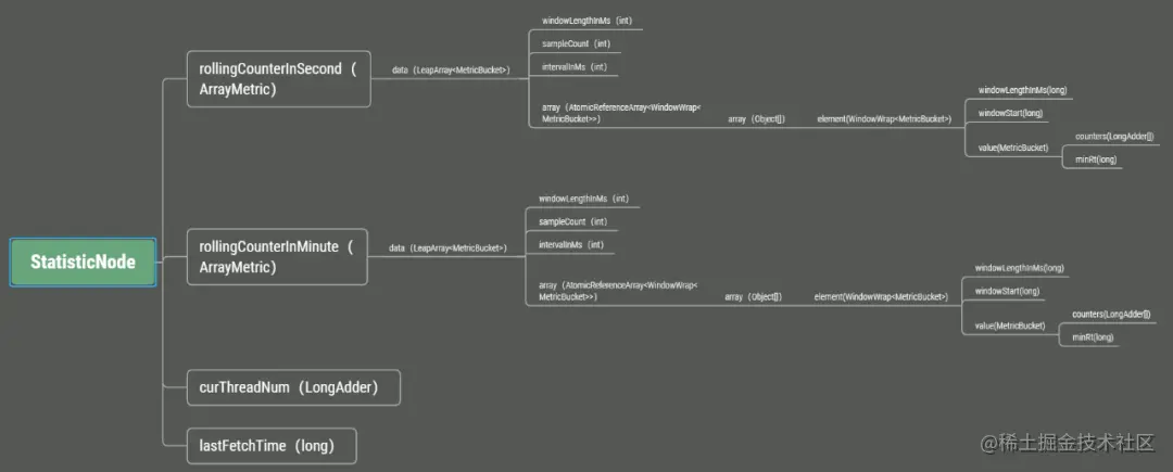 上面这张图已经很清晰的描述了StatisticSlot的数据统计的过程。可以注意一下无异常和阻塞异常的情况,主要是更新线程数、通过请求数量和阻塞请求数量。不管是DefaultNode,还是ClusterNode,都继承自StatisticNode。所以Node的数据更新要来到StatisticNode。